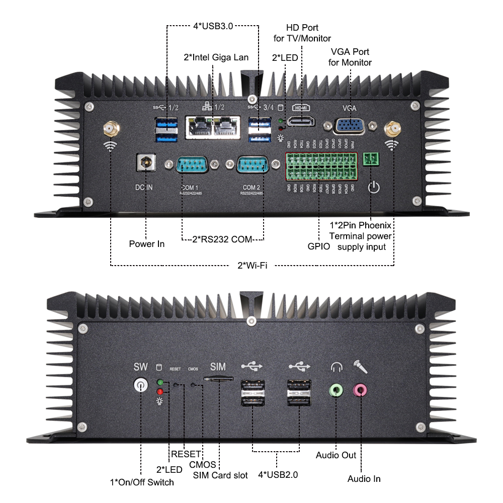 - Fanless system without cooling fan, fit for industrial grade field, work as long as 24 hours.